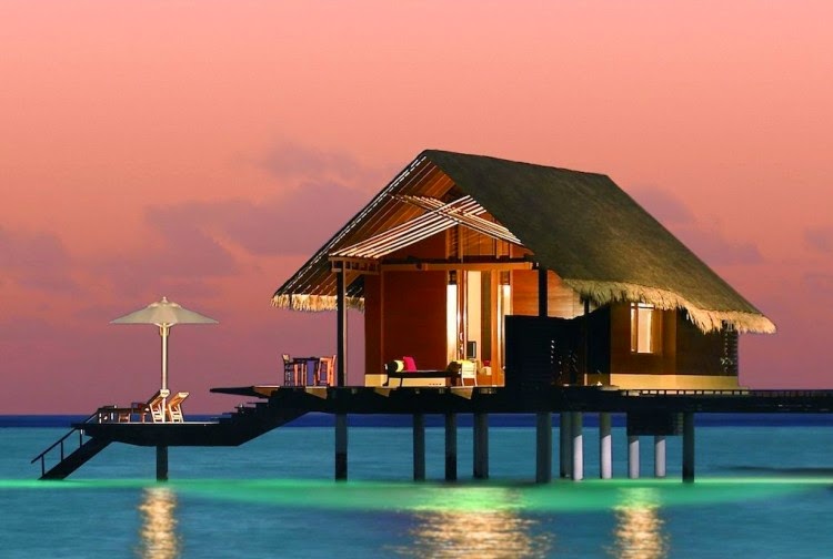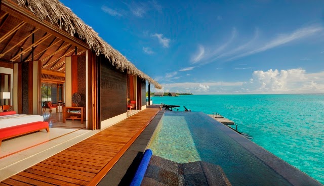 Villas include covered veranda and a split-level deck and a private outdoor pool suspended over the turquoise lagoon . Netting suspended like hammocks from its edges are perfect for breezy sunbathing.